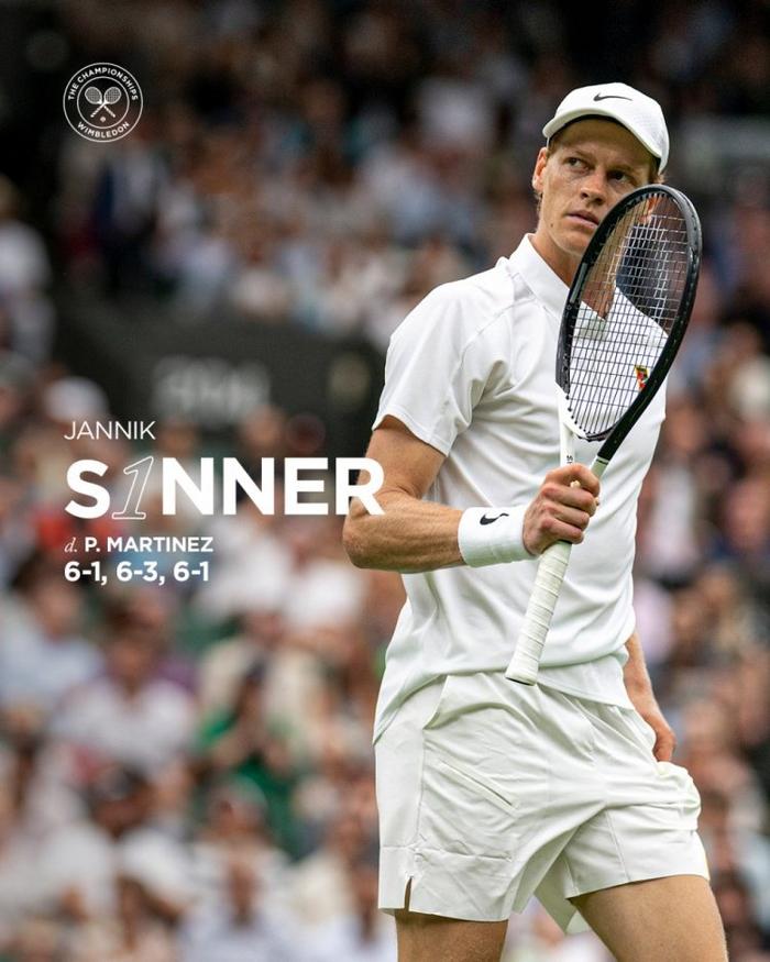温网男单第三轮,头号种子辛纳以6-1 6-3 6-1轻取西班牙球员马丁内斯,连续四年晋级温网男单16强。接下来,世界第一将面对迪米特洛夫与奥夫纳之间的胜者。