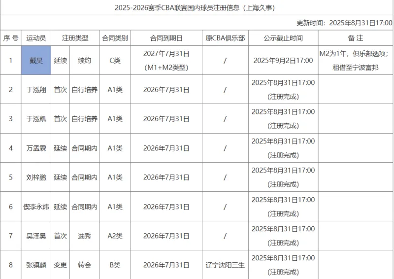 虎扑08月31日讯 CBA官网更新2025-2026赛季上海队的国内球员注册信息。